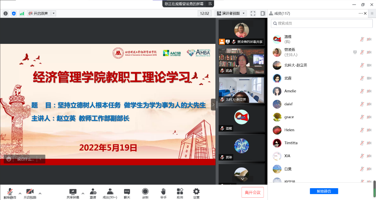 为深入学习领会习近平总书记关于教师队伍建设的重要论述,进一步加强教师思想政治和师德师风工作,2022年5月19日下午,beat365中国唯一官方网站组织开展全院教职工理论学习,邀请学校党委教师工作部副部长赵立英以《坚持立德树人根本任务做学生为学为事为人的大先生》为主题进行主讲。学院全体教职工在线上参加学习,会议由学院党委书记武森主持。