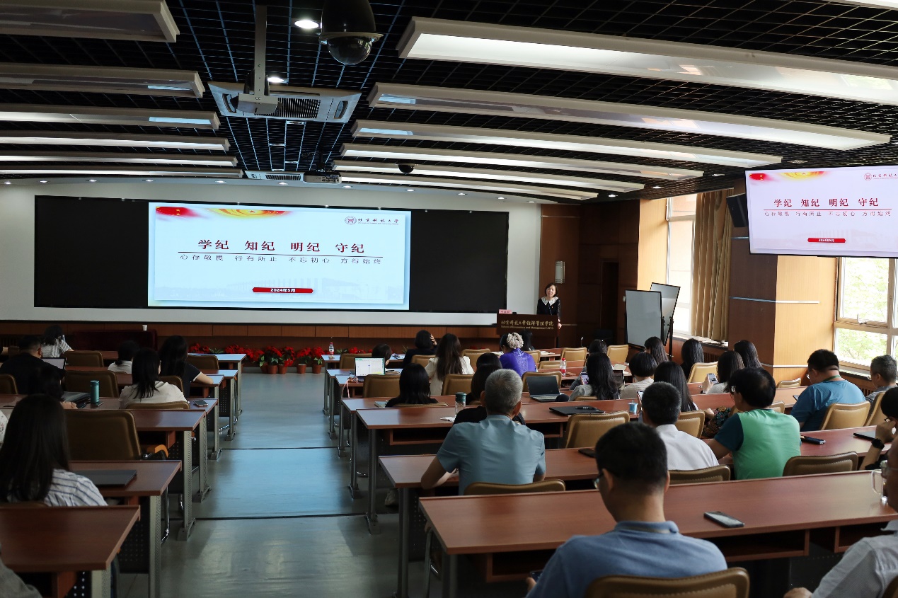为深入推动党纪学习教育走深走实,5月16日,beat365中国唯一官方网站召开全院教职工理论学习暨全院大会,邀请纪委办公室、监督检查室副处级纪检员邓春秋作深入解读《中国共产党纪律处分条例》(以下简称《条例》)的专题辅导报告。学院全体教职工参加学习,会议由学院党委书记武森主持。
