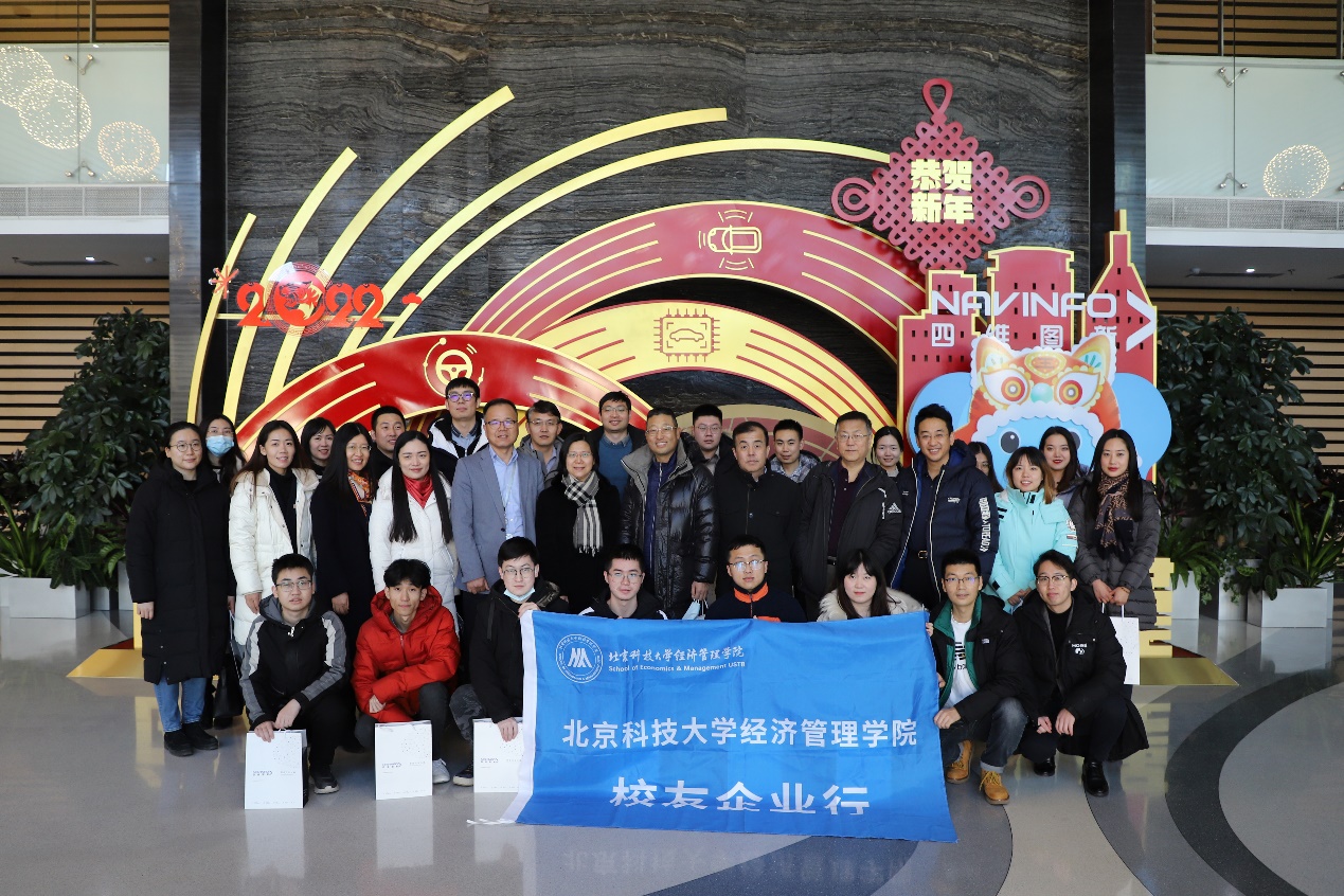On December 28, 2021, SEM organized a visit to NavInfo Co., Ltd., one of the alumni enterprises, to strengthen the exchange and contact among the alumni, SEM and students of SEM. Wu Sen, Chairperson of the Party Committee of SEM, Ni Yu, Deputy Secretary of the Party Committee and Associate Dean of the school, Wei Guiying and Yan Rui, teachers of the Department of Management Science and Engineering, Qin Yifang, Director of the Public Relations Office of SEM, Ge Yuyang, career guidance teacher of the school, alumni and students of SEM attended the visit.