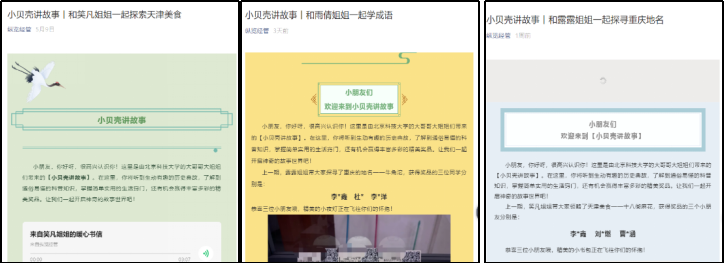 Up till now, the “Little Shell Storytelling” program has been launched for three times, including the introduction of the traditional Tianjin cuisine, the origin of a place called Niujiaotuo in Chongqing, and the interesting fable from Hebei Province called Learn to walk in Handan. Each story was created by students themselves and the themes were closely related to their hometowns. Students told growing stories, history stories, and Chinese stories in a lively and interesting way to the children, with thought-provoking questions and practical gifts at the end of each story. The activities have brought vigor and interest to children’s hospital life and have helped them broaden horizons, increase knowledge and stay positive in their life.