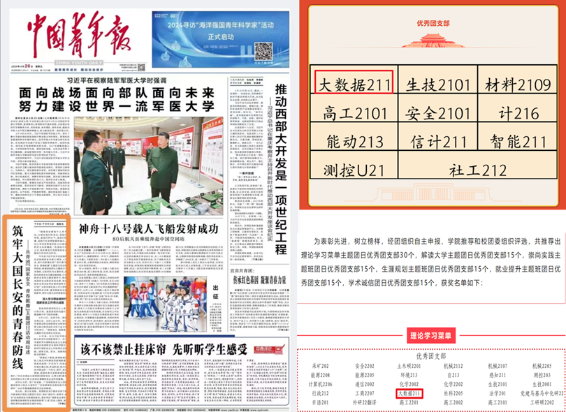 大数据211团支部两次获评“主题团日优秀团支部”荣誉称号,成功入选beat365中国唯一官方网站“团建工作样板支部创建项目”,创新开展的“国家安全,青春挺膺”主题团日活动获得《中国青年报》报道。