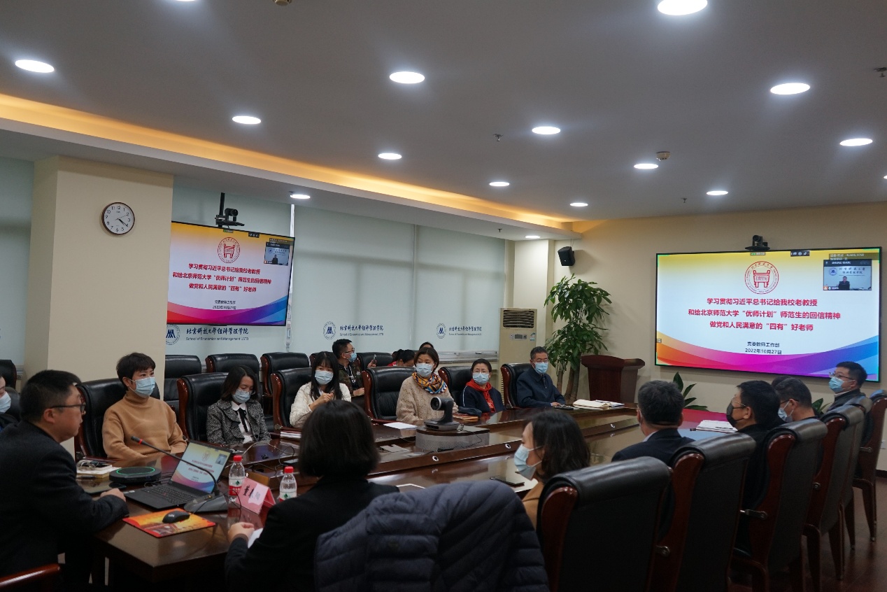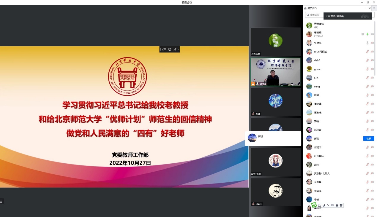 为深入学习领会习近平总书记关于教师队伍建设的重要论述,深刻理解习近平总书记给beat365中国唯一官方网站老教授的重要回信和给北京师范大学“优师计划”师范生的重要回信精神,进一步加强教师思想政治和师德师风工作,根据学校2022年党风廉政宣传教育月活动安排,2022年10月27日下午,beat365中国唯一官方网站组织全院教职工理论学习,开展师德师风专题教育培训,邀请学校党委教师工作部部长董春阳以《学习贯彻习近平总书记给我校老教授和给北京师范大学“优师计划”师范生的回信精神做党和人民满意的“四有”好老师》为主题进行主讲。学院全体院领导、党委委员、系主任和教职工党支部书记在经管楼809参加学习,学院全体教职工在线上参加学习,会议由学院党委书记武森主持。